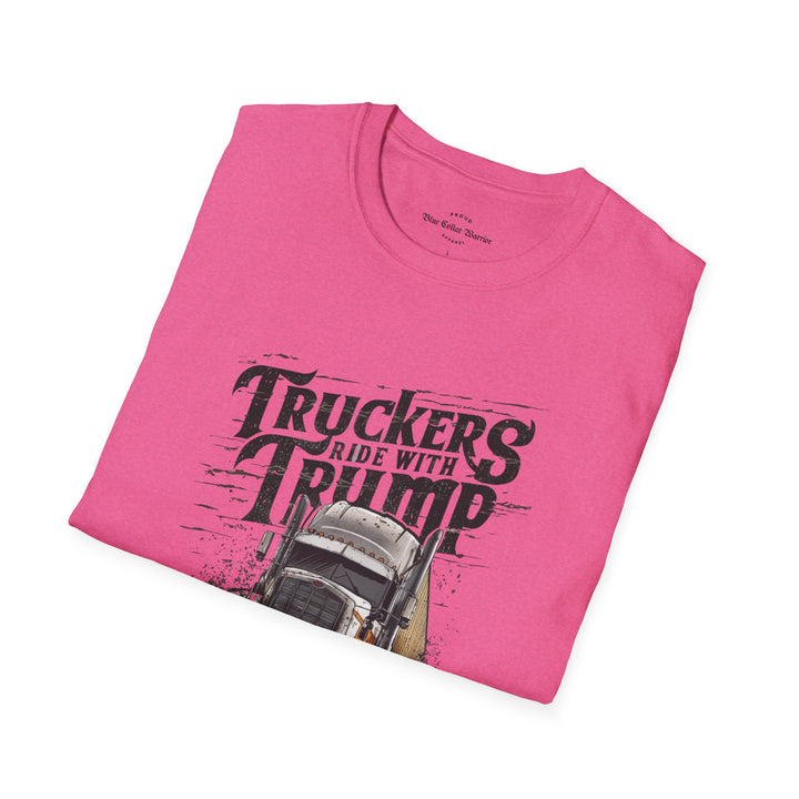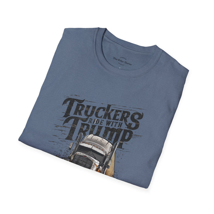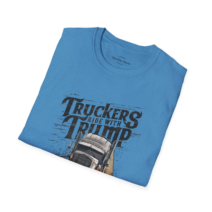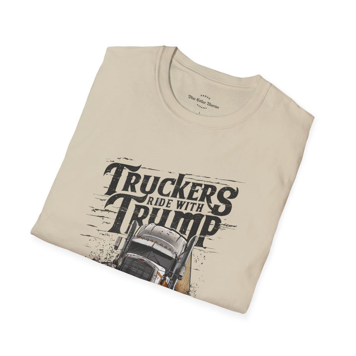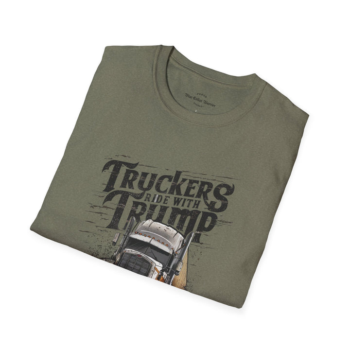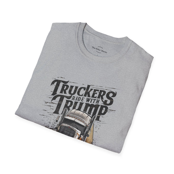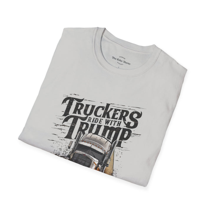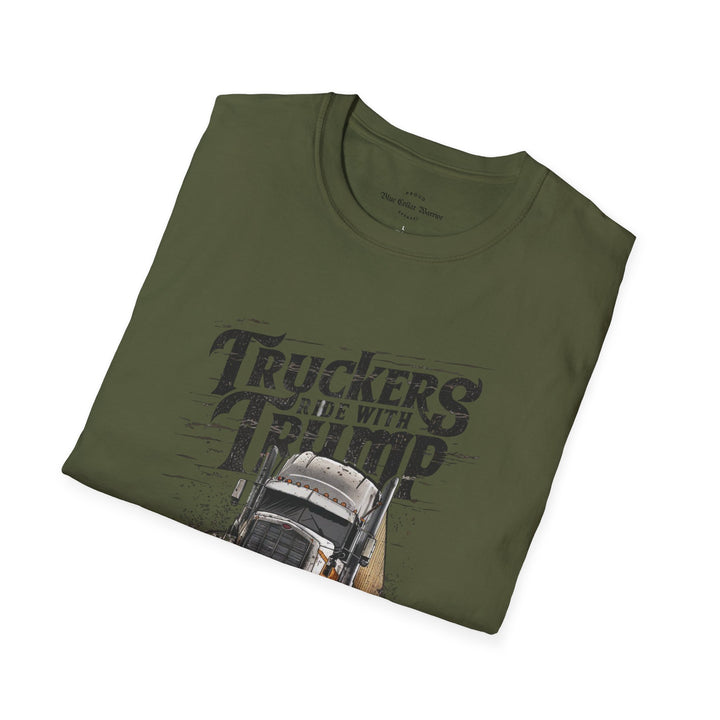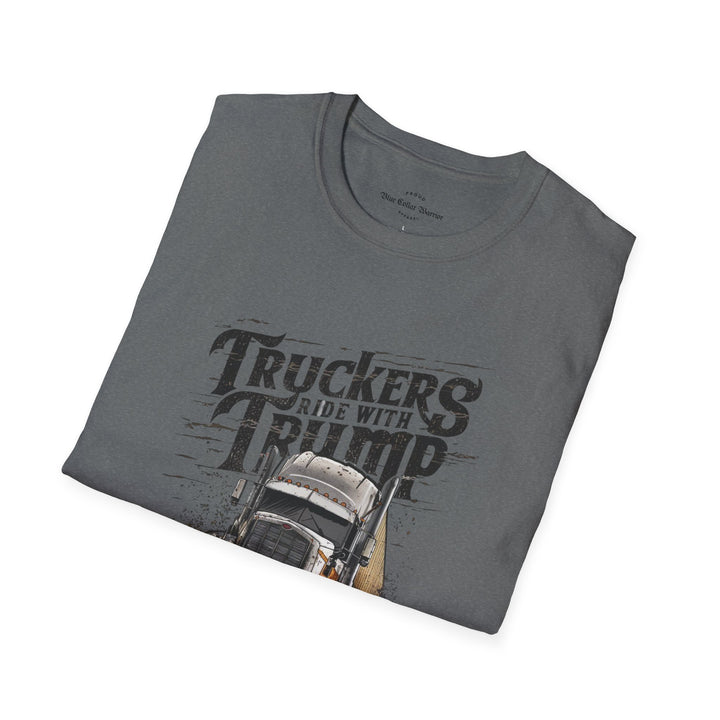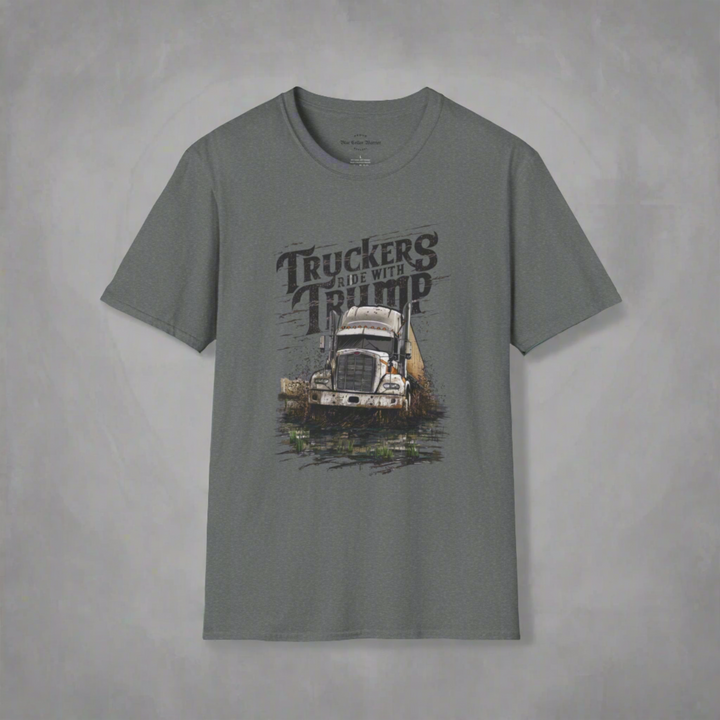 Support Trump's 2024 presidential campaign with our "Truckers Ride with Trump" unisex soft-style t-shirt. Crafted from 100% ring-spun cotton, it provides both comfort and durability for daily wear. The tee features a bold big rig design, making it ideal for both rallies and casual outings. Produced with ethically sourced US cotton and certified for safety, it symbolizes American values. Join the movement and prepare for a brighter future with Trump. Made for true Americans who value hard work, patriotism, and service, this tee is perfect for military personnel, veterans, and those who uphold the core principles of our nation. It's designed to support you through difficult days and long hours.