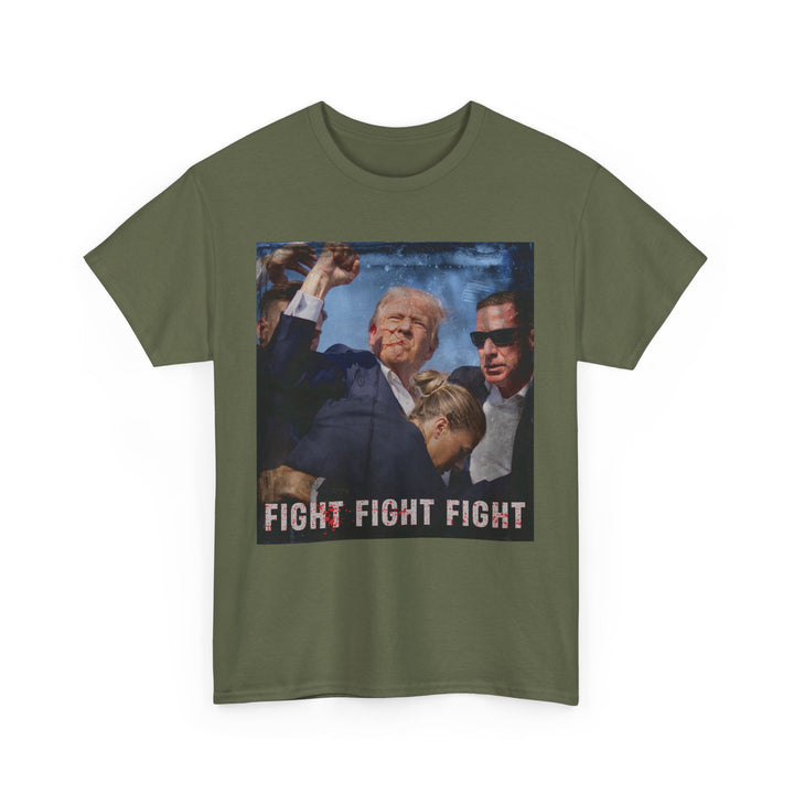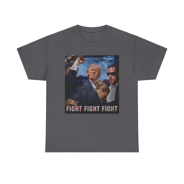 Stand strong and show your support for Trump's 2024 run with our heavy cotton T-shirt. Featuring a bold graphic of Trump pumping his fist with "Fight, Fight, Fight" on the front, this T-shirt symbolizes resilience and determination.